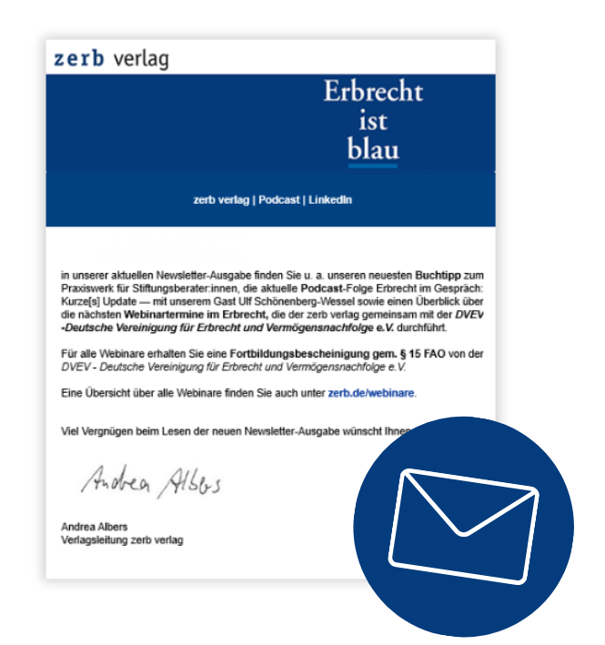 Melden Sie sich zum kostenfreien Newsletter des zerb verlags an und profitieren Sie von regelmäßigen Informationen rund um unsere aktuellen Webinare, Neuerscheinungen oder auch erbrechtlichen Fachbeiträge renommierter Expertinnen und Experten.